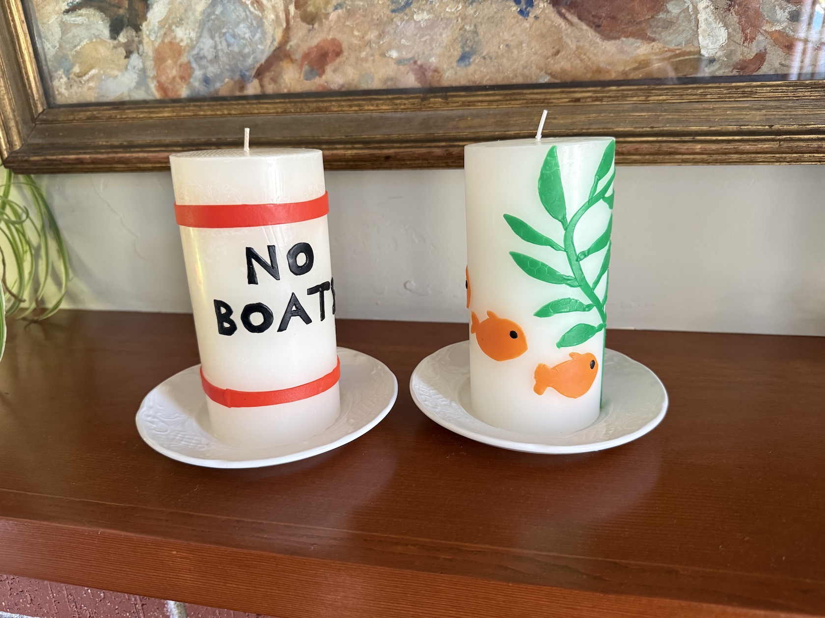 My goddaughters heard about my aspirations and handmade an inspirational gift for Christmas: candles of the buoy itself and the kelp and Garibaldi underneath. I’m going to burn it all down.