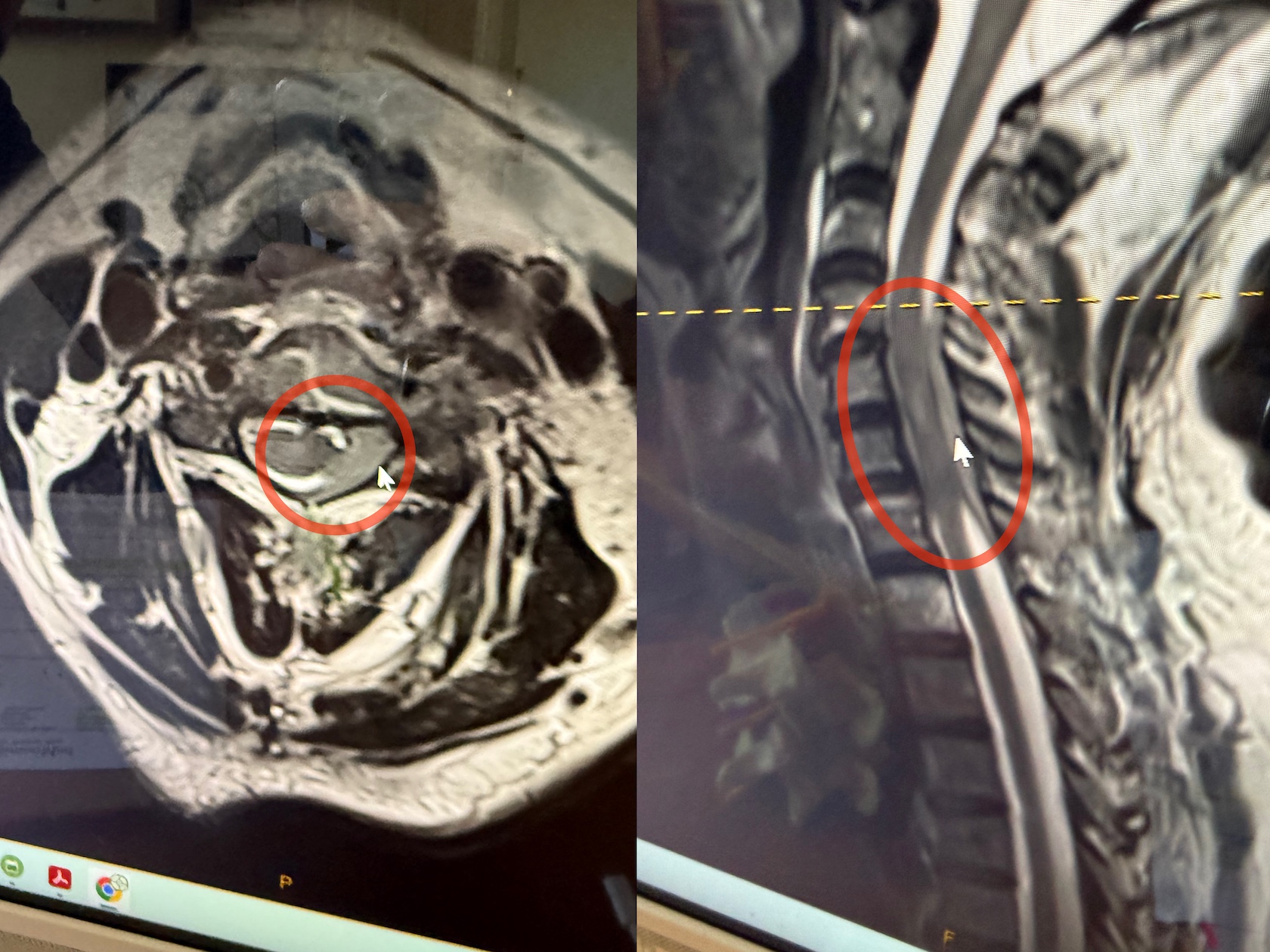 The MRI showed that I had a mass in my spine that was pressing on the fluid that protects and nourishes the spinal cord. My neck was screwed up more than anyone expected and needed immediate attention. A referral to oncology at Hoag Hospital got us into the ER on the 19th.